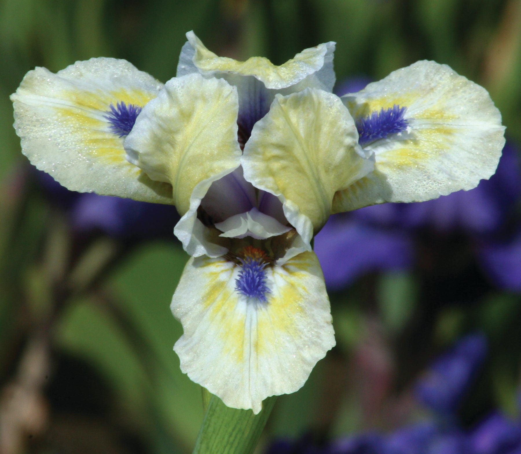 Standard Dwarf Bearded Iris: Cream and yellow standards; white falls with a chartreuse green thumbprint. Beards a vibrant blue. Fragrant and bred to rebloom.