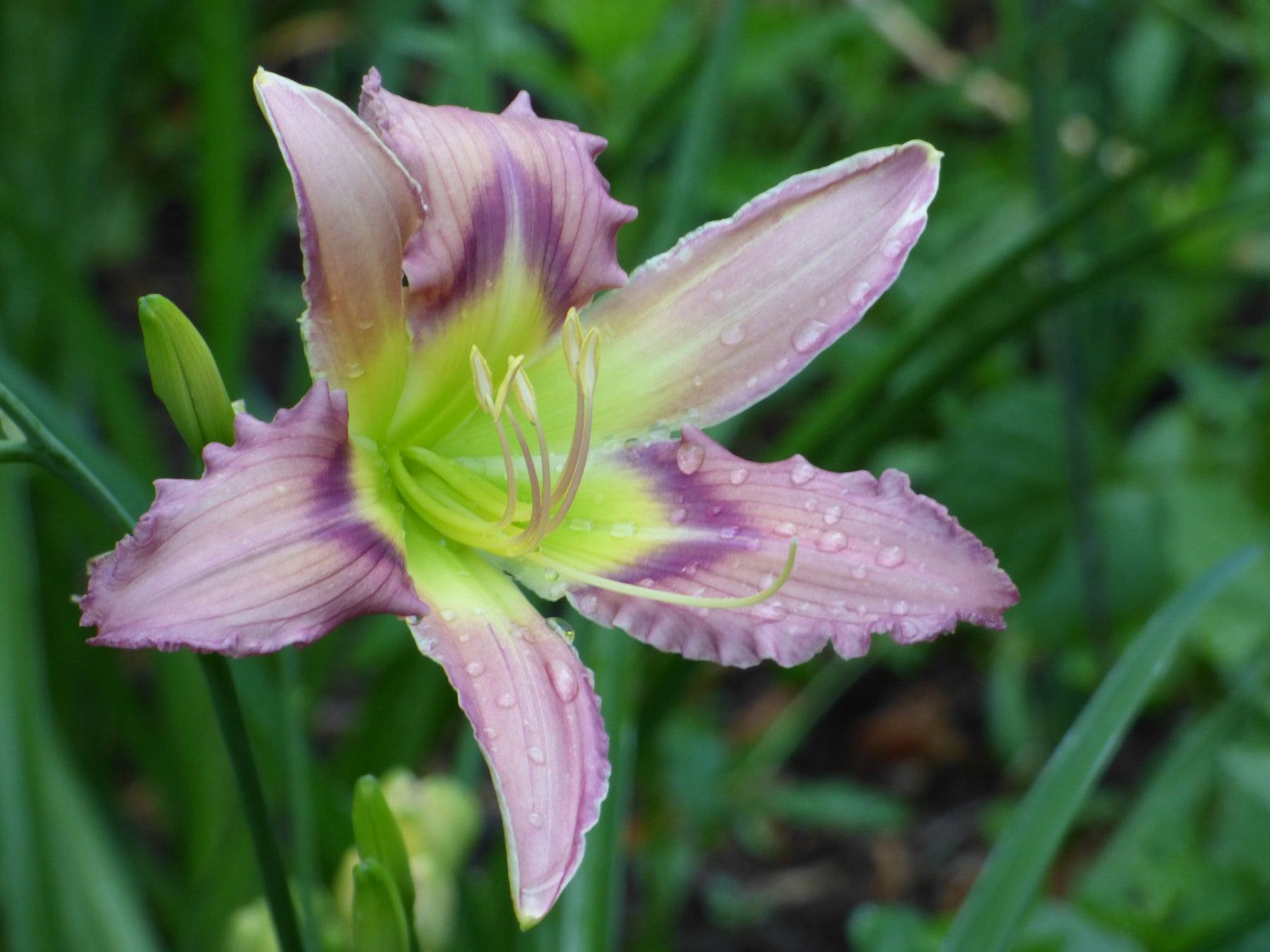 Lavender and cream, banded darker grayed lavender, petals lightly ruffled and fringed, large green throat. (Moroccan Sapphire × Iroquois Maiden)