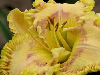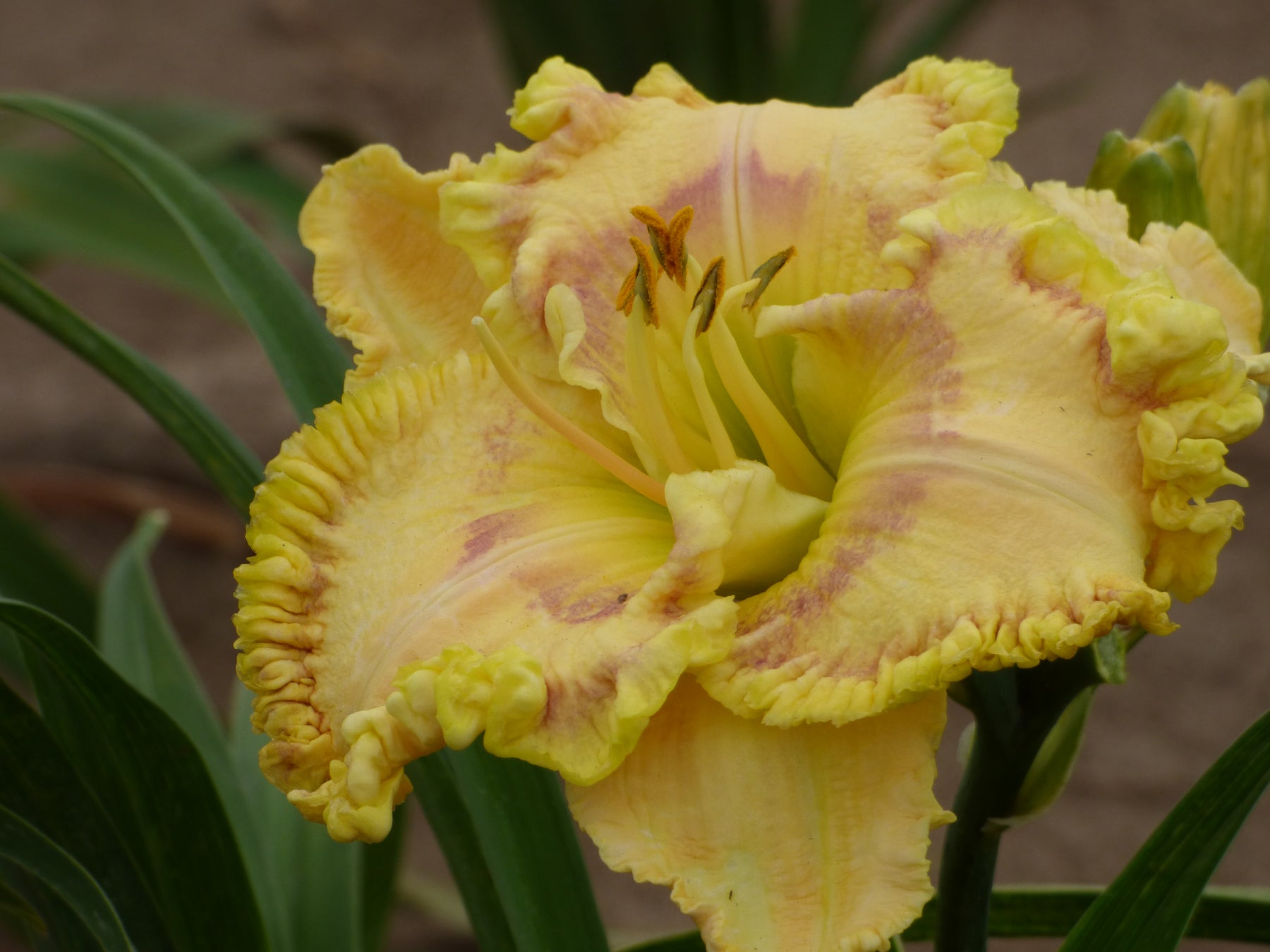 Color:Creamy yellow (RHS 18A) petals with rose blush, light purple (RHS 85D) eye, light yellow (RHS 11A) throat, heavily ruffled, three eighths inch edge of lemon mixed with purple (RHS 13B).