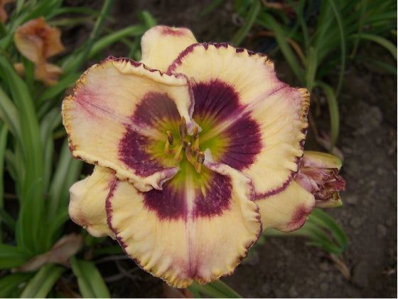 Smooth Talker is a tetraploid daylily featuring bright plum violet patterned eyes with starburst designs set against a light cream background. This semi-evergreen plant produces large 6.75-inch blooms on four branches, with 21 to 25 buds. Its diurnal bloom habit ensures vibrant flowers open during the day, making Smooth Talker a striking and reliable addition to any garden.