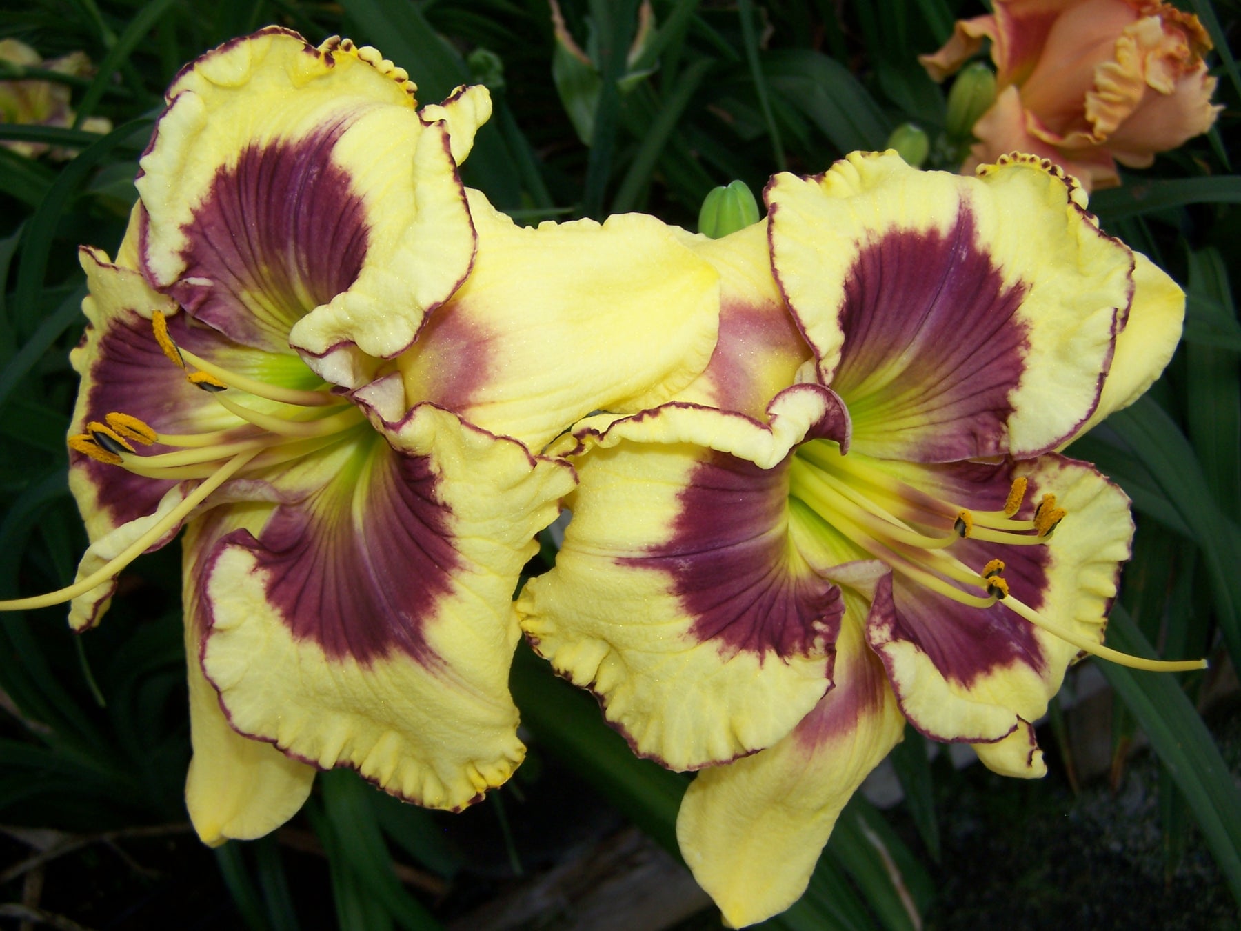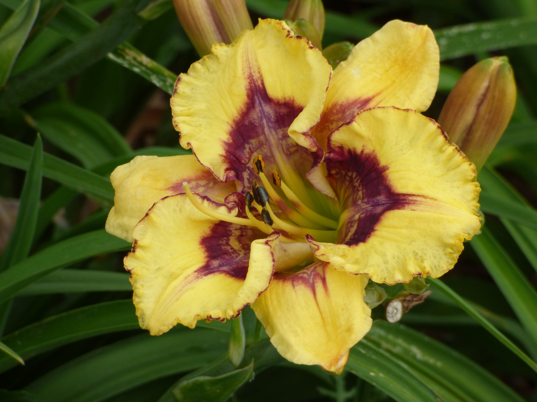 Zyzzified is a fragrant daylily featuring a wine red multicycle pattern over a light yellow base with a green throat and ruffled petals. Its blooms measure 6 inches in diameter and open during the day. This semi-evergreen tetraploid variety is bred from a seedling crossed with Four Beasts in One, combining striking color patterns with robust growth.