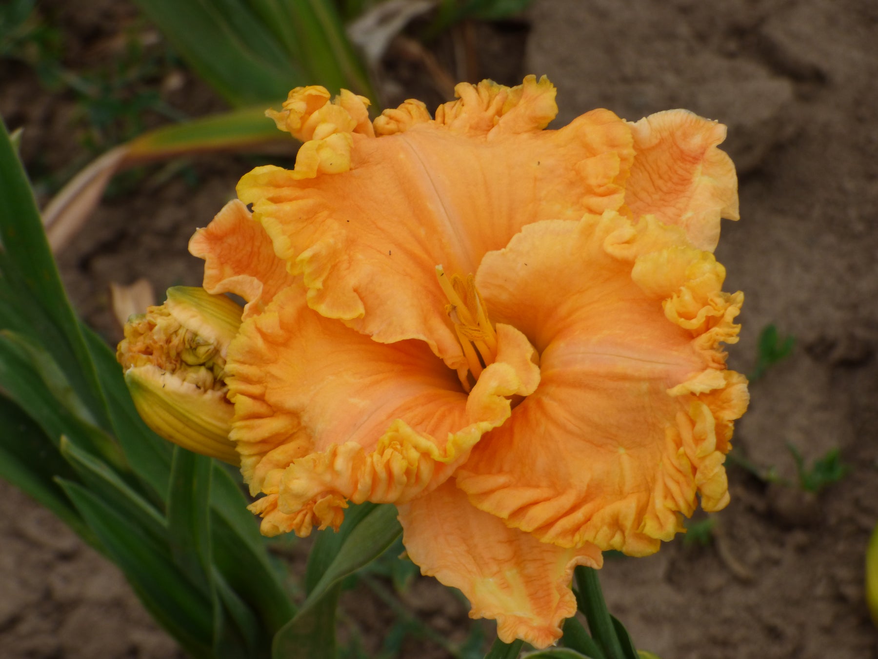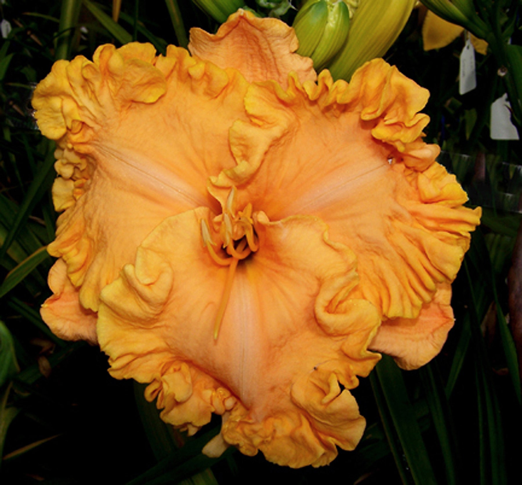 Color:Deep orange (RHS 24A) petals with rose blush (RHS 43A), slightly lighter midribs, heavily ruffled and round form.