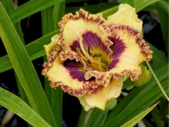 Color:Petals and sepals RHS 20B, blue violet (RHS 80A) eye, cream yellow throat, and three eighths inch marbled yellow and purple edge.