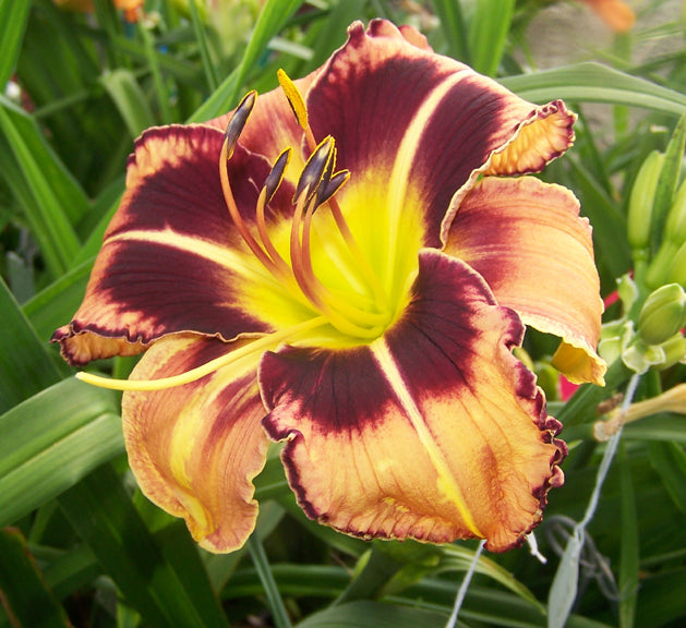 Bee Dance features 7-inch flowers on 32-inch tall stems, blooming mid-season as a reblooming tetraploid. Its grayed orange petals (RHS 164B) are accented by a very dark maroon eye (RHS 46A) and a prominent light yellow stripe running down the center of each petal, giving this open-form seedling a distinctive and individual character. A vigorous grower with no fragrance, Bee Dance is a cross between PARTY PINWHEEL and a seedling, making it an excellent choice for expert gardeners.