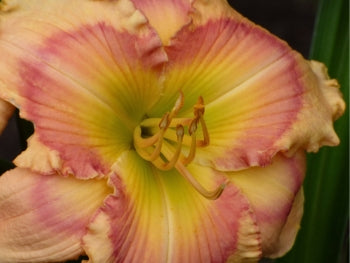 Color:Muted pink (RHS 29B) petals, large, diffused reddish maroon (RHS 51A) eye, yellow (RHS 21C) throat, round, recurved petals.