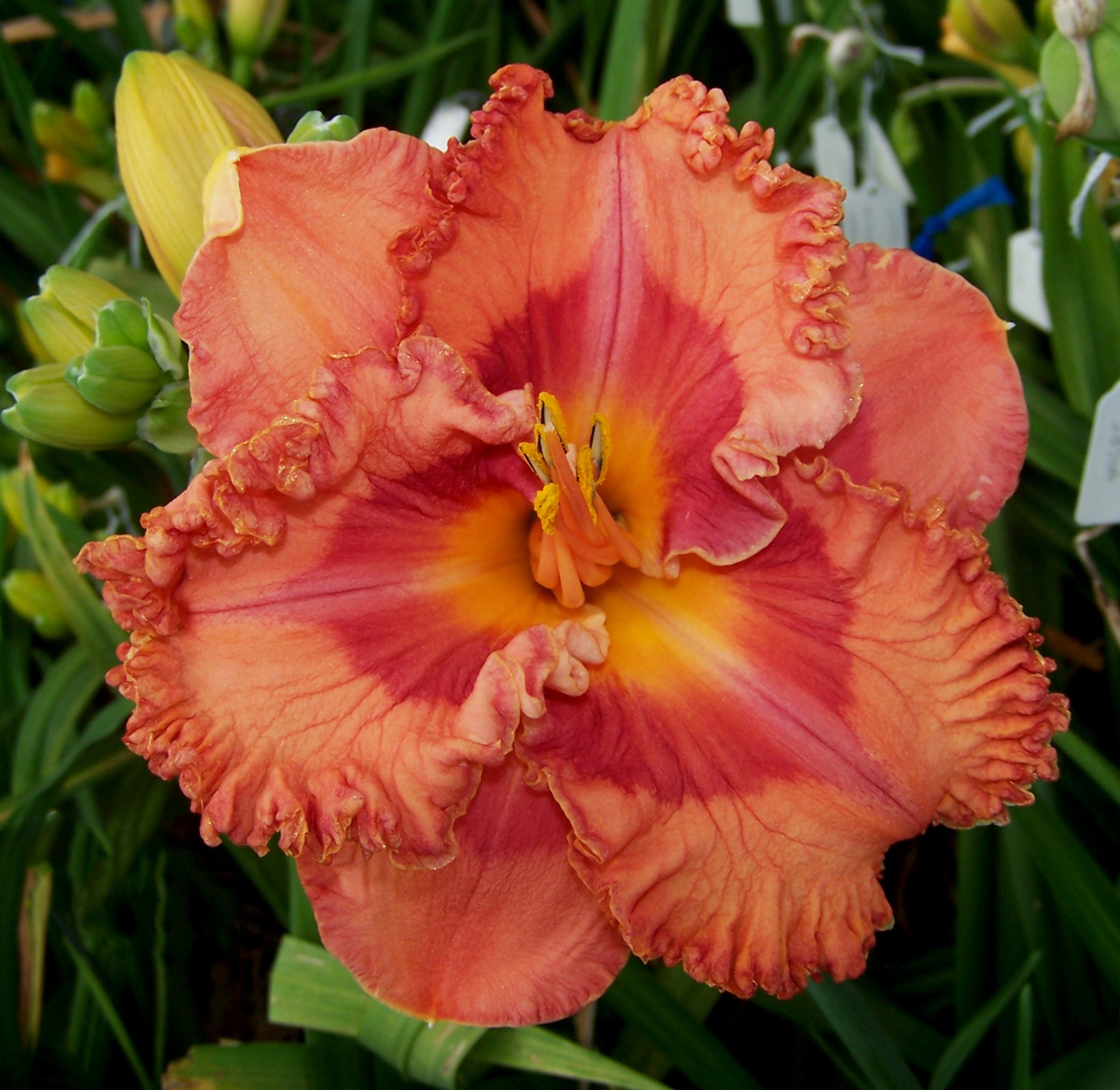 Memorial Day is a reblooming tetraploid daylily with semi-evergreen foliage, featuring 5-inch diurnal blooms. The flowers display deep red-orange petals (RHS 41A) complemented by a gold throat and dark red eyes, creating a striking contrast. This cultivar produces 20 buds across three branches and is derived from the cross of Valentine Wishes and Perceptive (seedling S434A), offering gardeners a vibrant and reliable floral display.