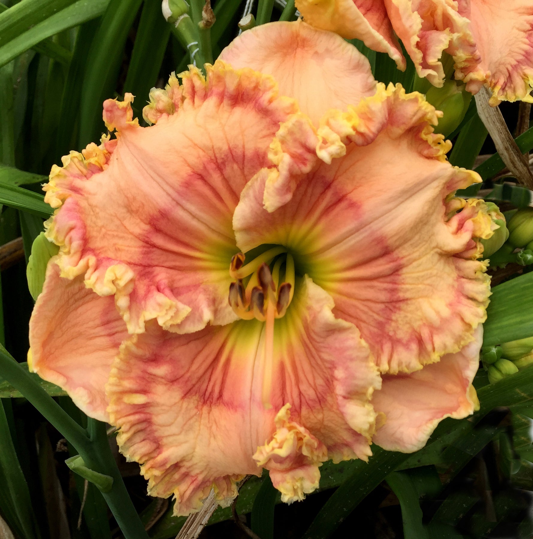Sending Love is a tetraploid daylily featuring medium pink petals with a darker pink eye and a yellow-green throat. The blooms are heavily ruffled with a delicate one-eighth inch rim combining darker pink and gold. Each flower measures 6 inches in diameter and appears on three branches with 25 buds. This semi-evergreen plant has a diurnal bloom habit, producing vibrant flowers during the day. It originates from seedling U473A, making it a beautiful and reliable choice for daylily enthusiasts.