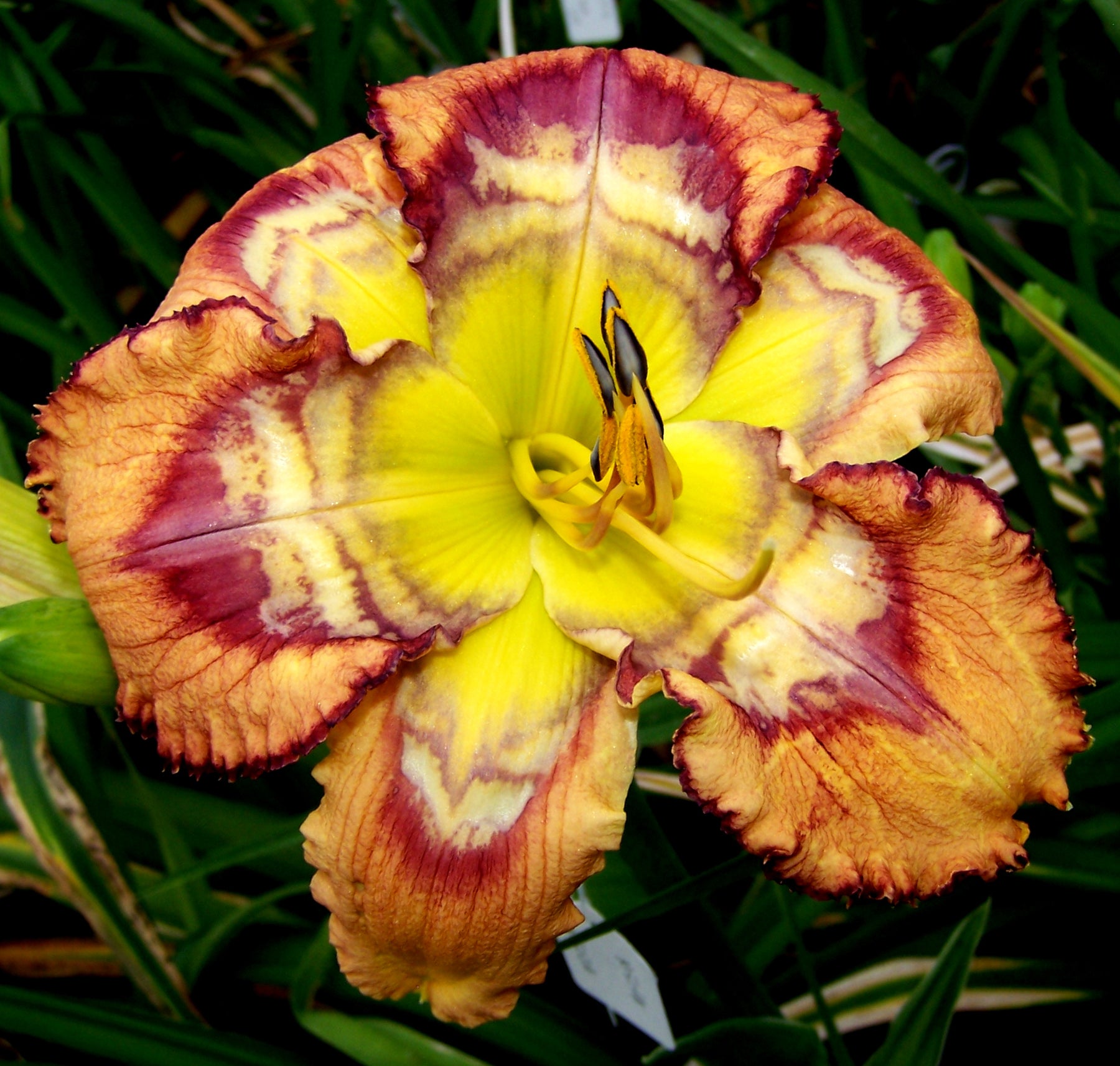 Trembler is a tetraploid daylily that has been central to our patterned breeding for about five years. It features caramel petals with a maroon eye and a striking, contrasting pattern on both petals and sepals. Developed from seedling N514A, a cross between K1435N and All Revved Up which itself can display patterns. This variety produces 6-inch blooms on three branches with 12 to 20 buds. With semi-evergreen foliage, Trembler is an essential choice for those interested in distinctive patterned daylilies.