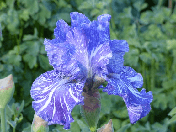 Blutique's large white flowers are covered with irregular streaks and splashes of medium blue-violet, very similar to the color pattern of its illustrious parent, Batik.