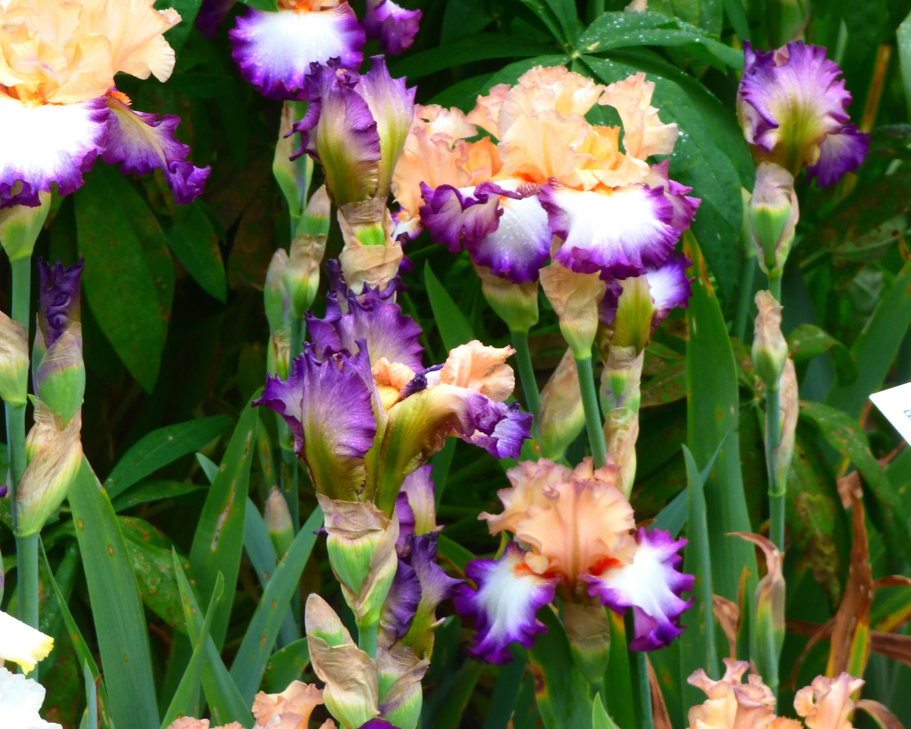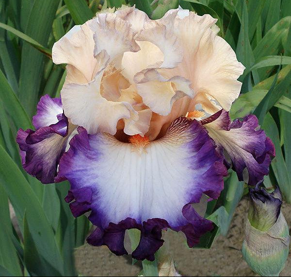 Apricot peach standards deepen at the base on this early bloomer. Broad white falls are edged blue purple, and finally- dark rose on the rim. Tangerine beards raise the volume and mahogany haft marks continue the conversation.