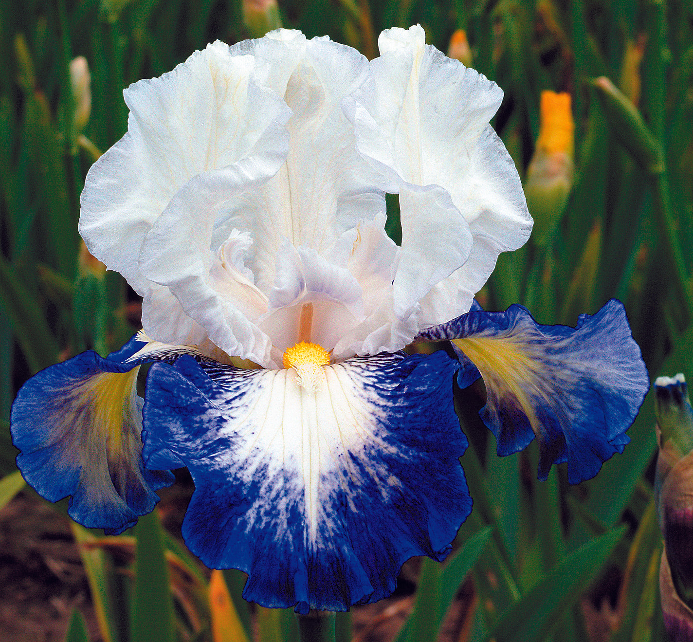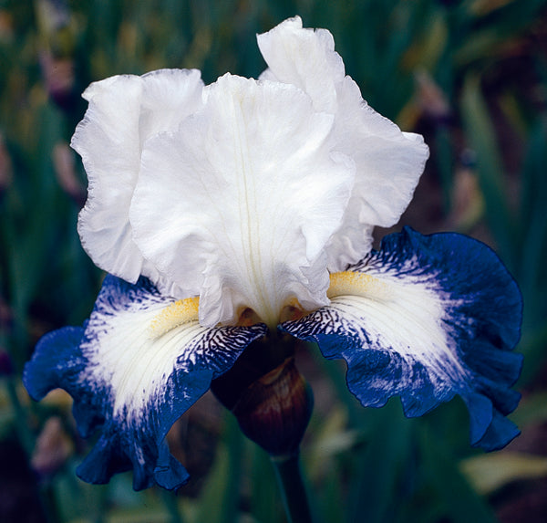 This impervious creation is one of our most innovative amoena introductions. Note the broad 1 1/4" band of fresh ultramarine blue which gently washes the edges of the spotless snowy white falls. Add pristine white standards with glowing yellow beards and we have perfection indeed. This pattern amazingly does not trace its ancestry to plicata breeding. Don't miss out! Be the first to grace your garden with our stunning achievement.