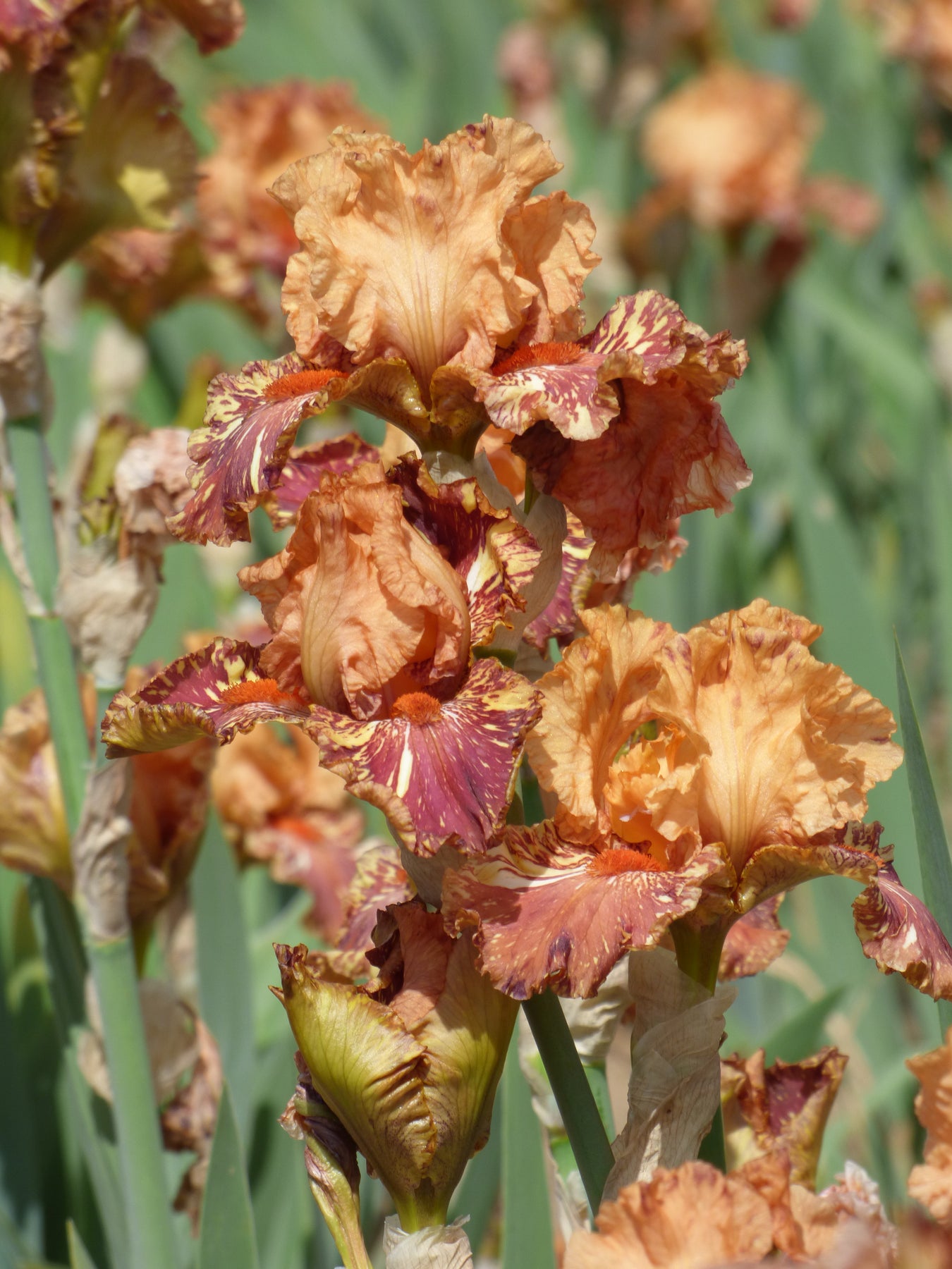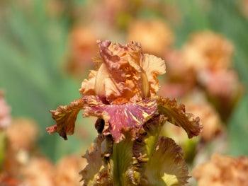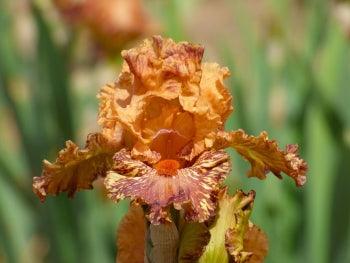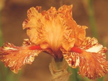 Burnt orange-apricot ruffled petals. Flaring falls overlaid with a deep garnet netting pattern and creamy streaks. Bright tangerine beards lend an exuberant spirit.
