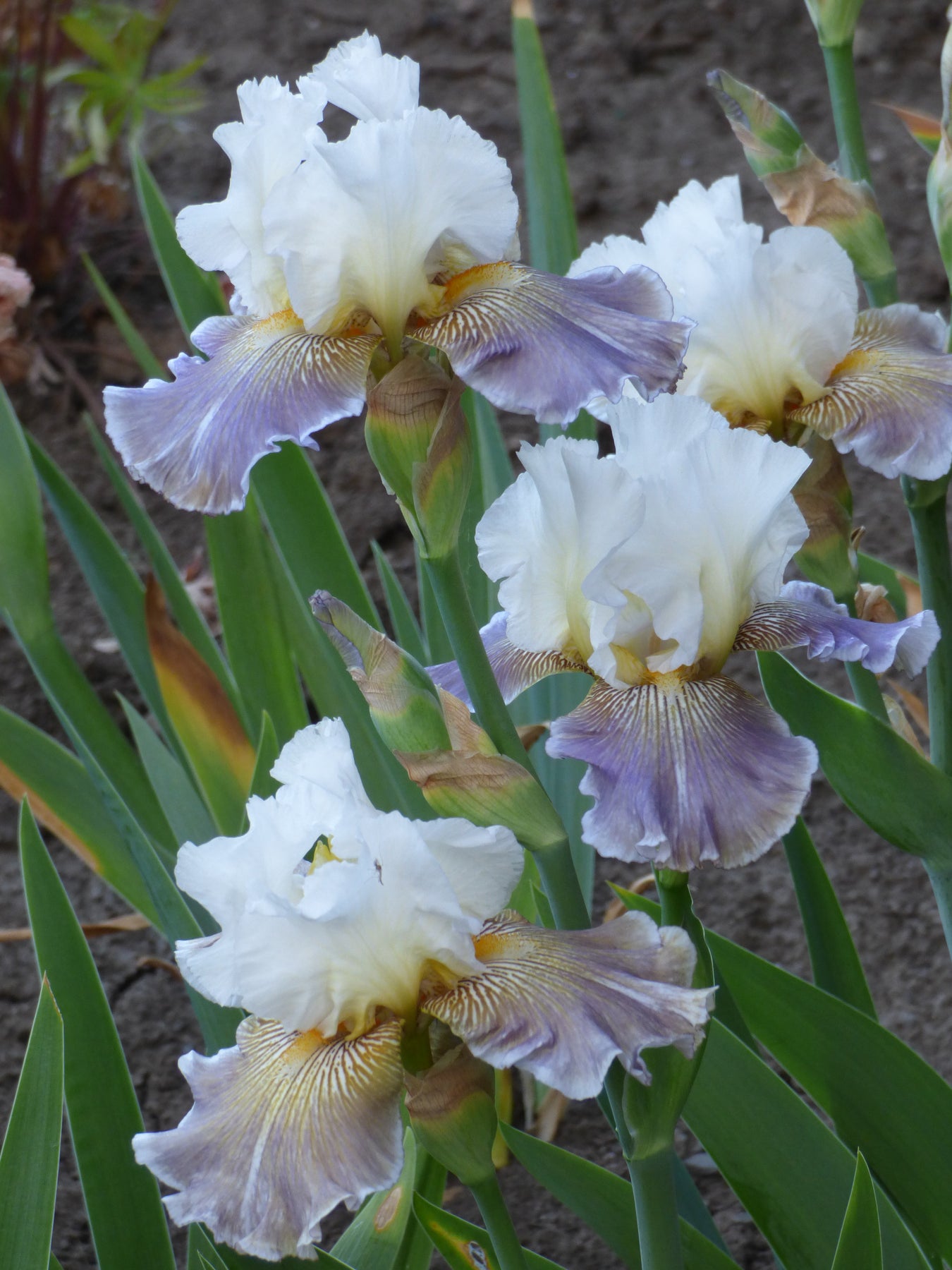 Pure white standards rest atop gray falls overlaid with red/brown swatches on the upper falls, and concluded with heliotrope crescents at the bottom of the petal. Flaring falls with yellow beards.