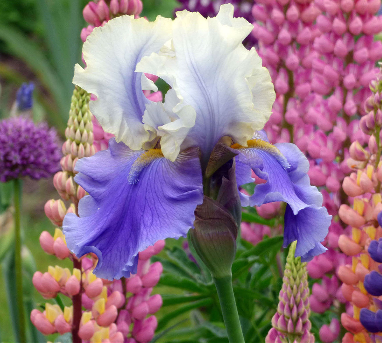 Tall Bearded Iris: This tall neglecta is a very modern update of its eminent parent, Dover Beach. Its arched and domed heavily ruffled standards are pale bluish white yellowing at their edges. The dark blue color of the falls lightens at their ruffled edges, with brown at the shoulders. Dream of You's slight fragrance is a bonus.