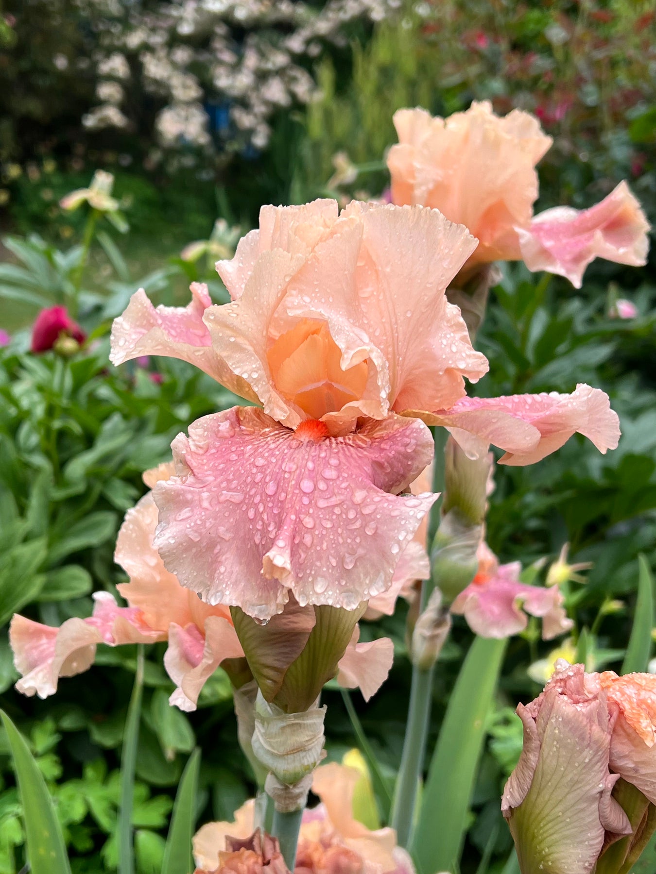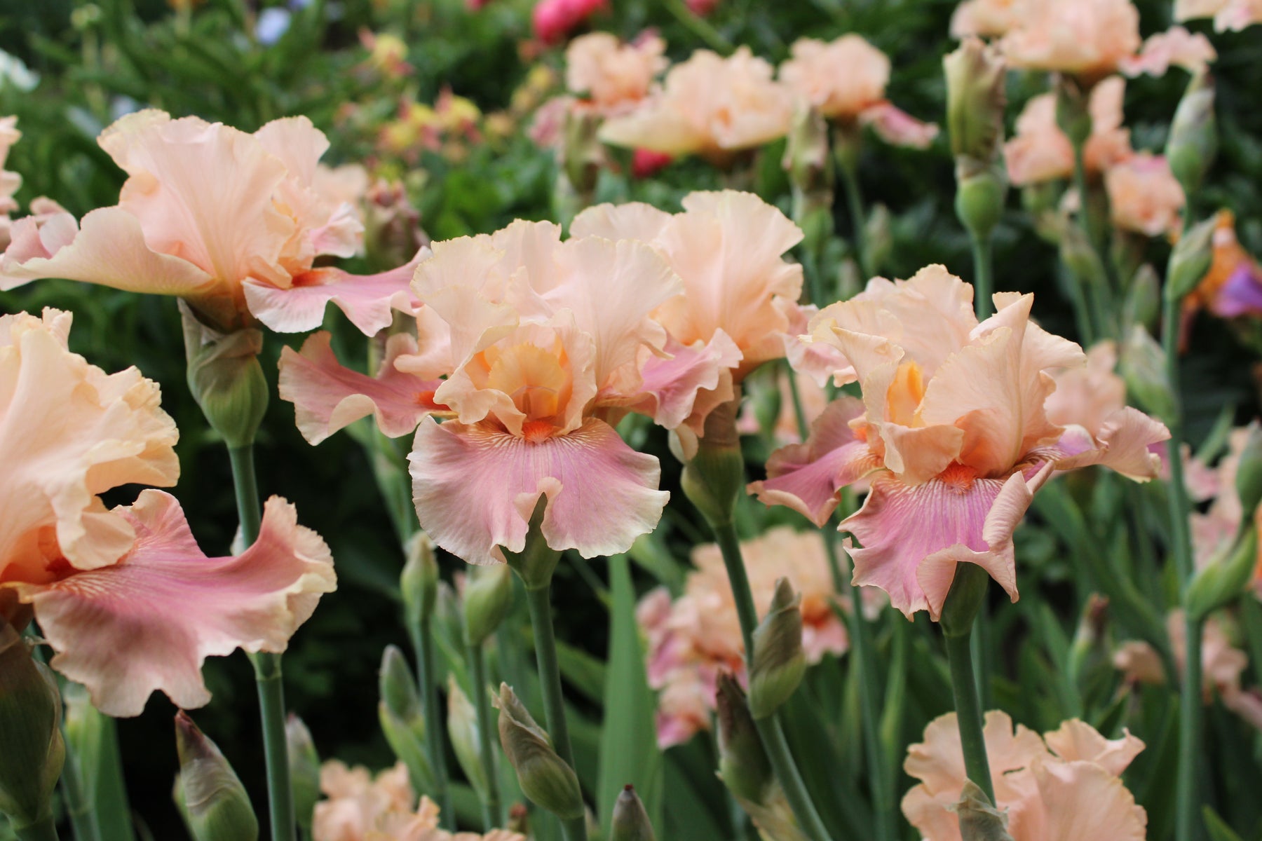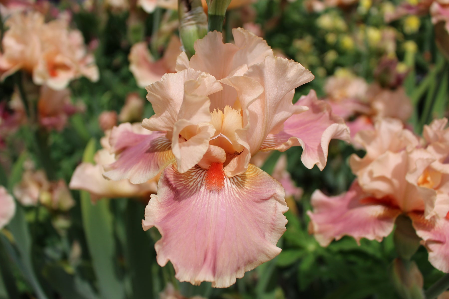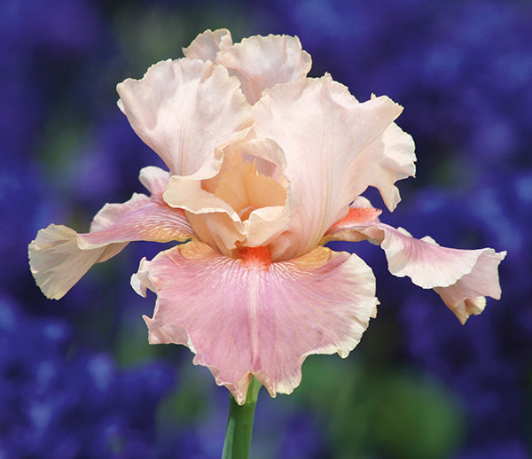 Entitled’s large flowers contain charm galore. Peachy pink standards present a gentle blending with the rosy pink, flaring falls. Orange beards, 7-9 buds per stem, 3 branches double-socketed help insure Entitled’s appeal. Notice in our photo how a 1/4” light pink band around the falls reflects the standards, as well as adding another dimension.