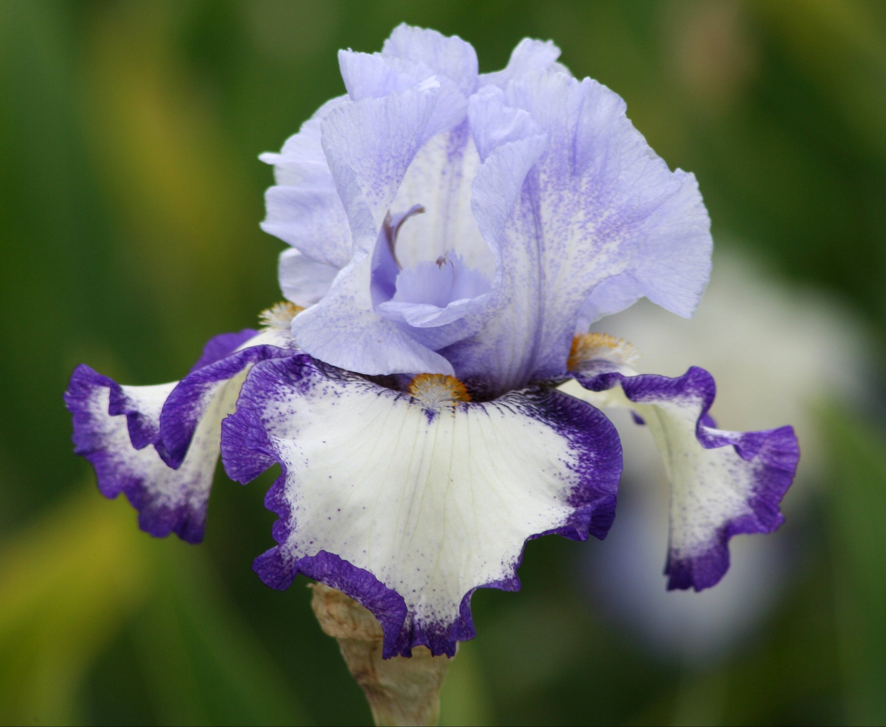 See in our picture how the white standards seem to have been graced by nature's paint brush. Not only have they been artistically enhanced by lavender shading, they have also been speckled and sanded. Meandering around the pristine falls is a beguilingly blue purple band. I Am sports admirable form, big flowers, 8 buds on a stalk, 3 sockets, and the absence of an identity problem.