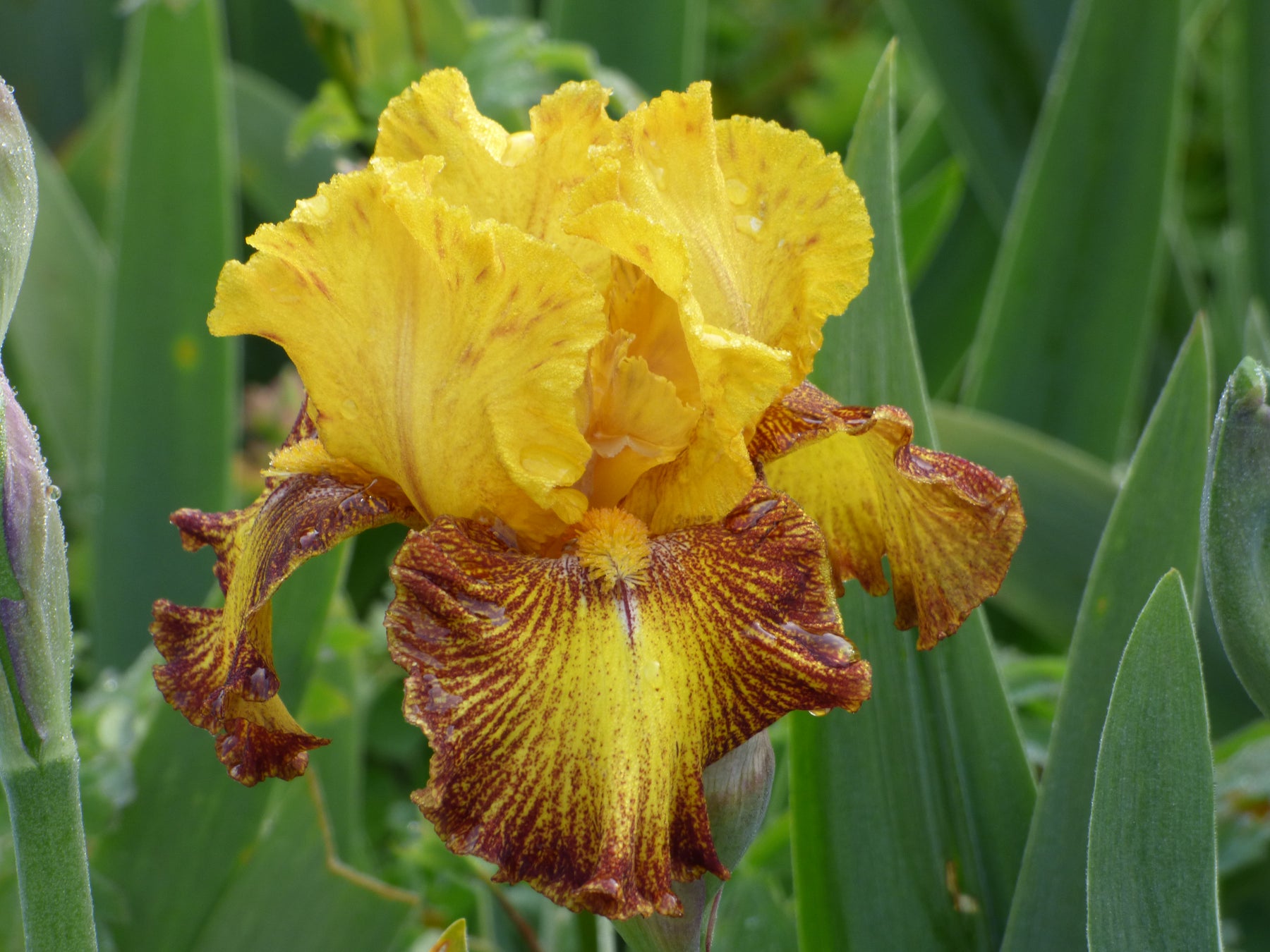 This variegata-plicata certainly dances to a jazzy cadence! Its standards are a clear chrome yellow, while the yellow grounded falls are peppered with light rays of russet red creating a speckled effect. Light ruffling just adds to the excitement. Three-branched stem with 8-10 buds.
