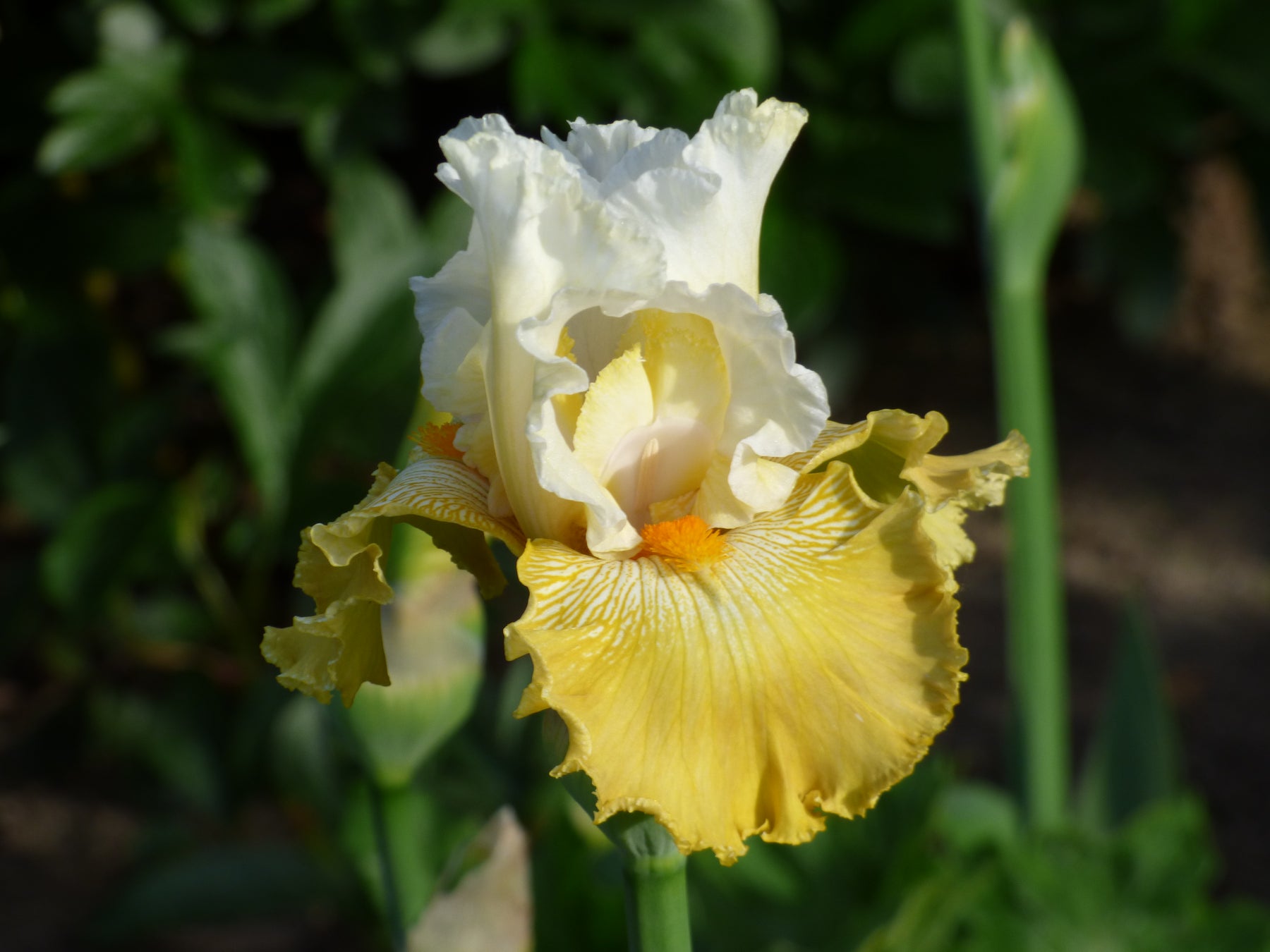 Imagine a beam of sunshine on a spring morning. Kissed by the Sun presents us with the stark contrast of pristine white standards and deep daffodil-yellow falls. Best of all is its exquisite flower form. The bouncy ruffles and wide petals (4 1/4" x 7") of this spellbinder were produced by pod parent, Overjoyed, crossed with the intense colors of Echo de France and Tulip Festival.