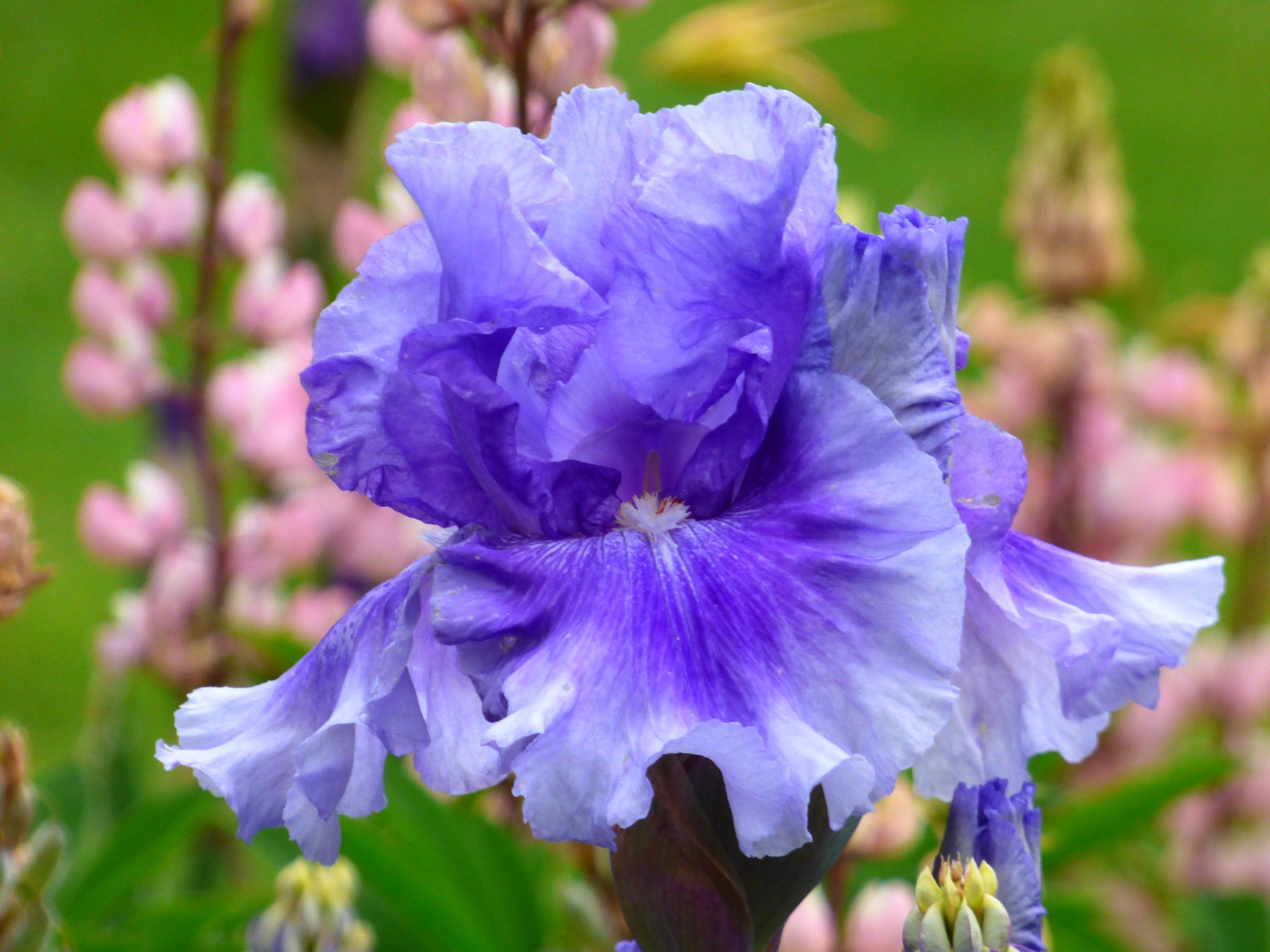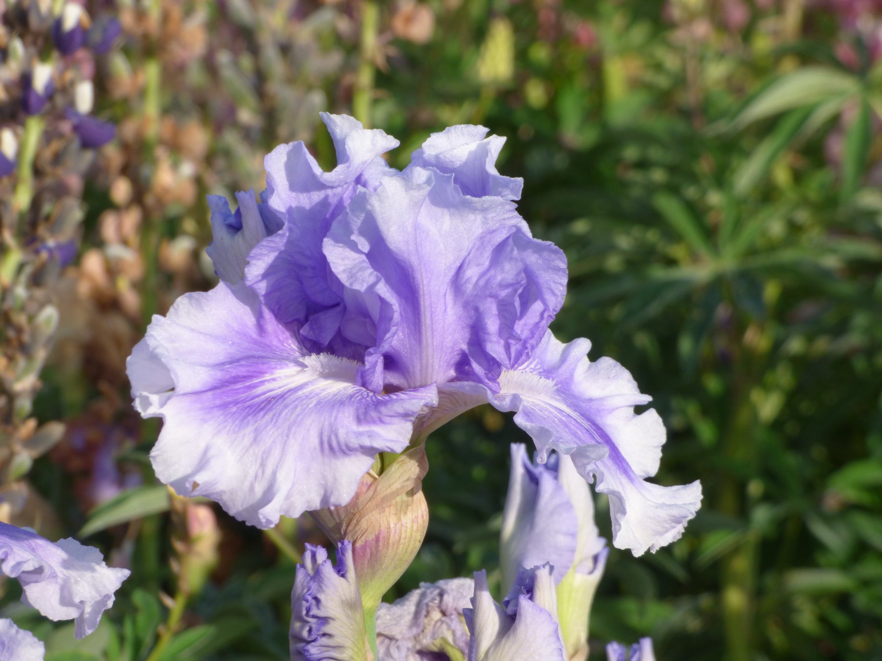 This stunning Iris has a fascinating and different color pattern. Its large pleasantly ruffled flowers have two-thirds of the falls' centers heavily washed in cerulean blue-violet. This pronounced brushing blends to a wide band of azure-violet on their edges. The standards echo this same shade of light blue-violet. No Count Blues consistently produces tall show-bench stalks with three branches and 11-12 buds per stem. Its fresh color and novel pattern give this variety remarkable personality.
