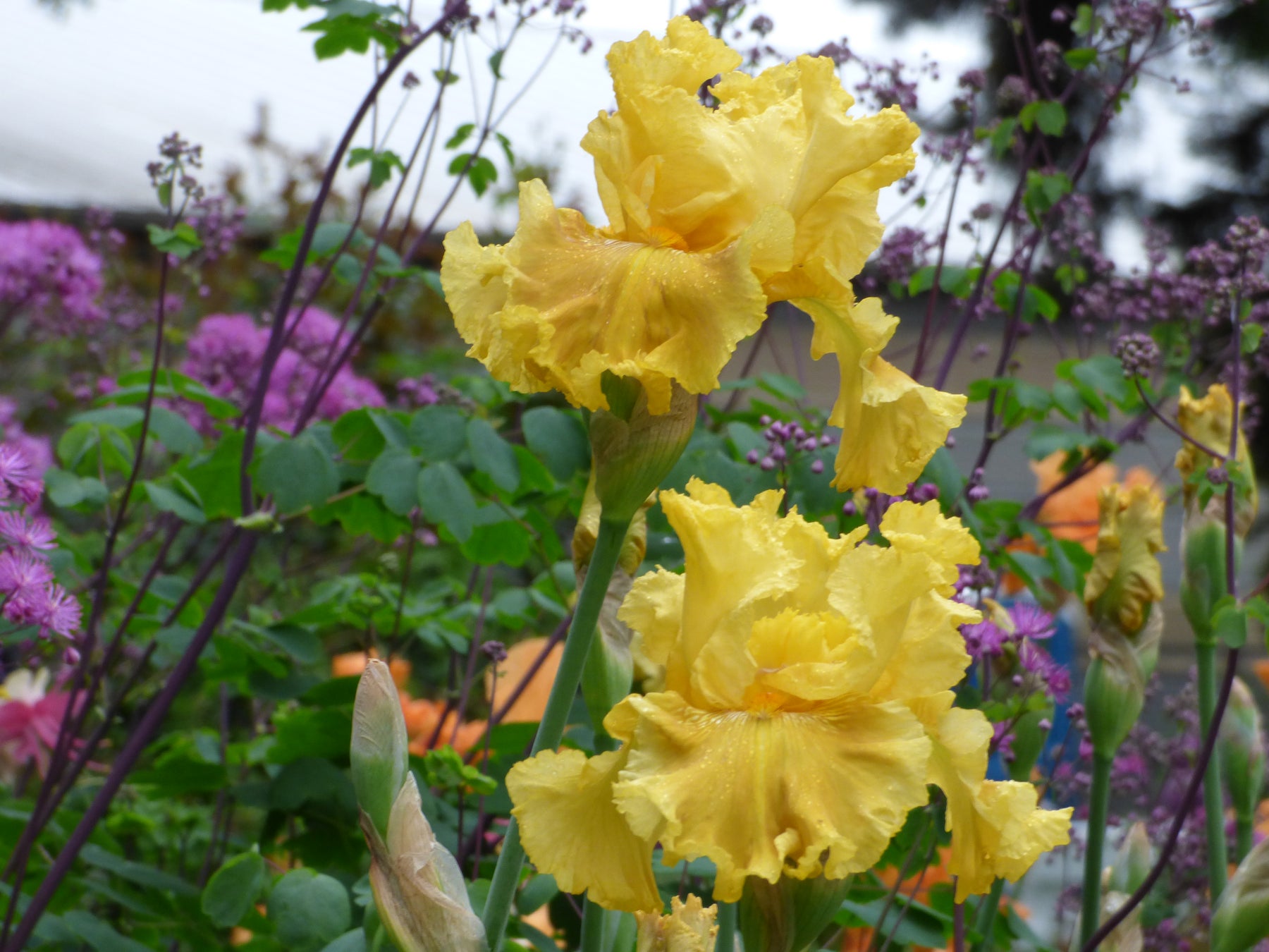 September 2020 will long be remembered here in Oregon for the firestorm that descended upon the communities nestled along the western foothills of the Cascade Mountains. At one point, the fires raged within 20 miles of our farm here in the Willamette Valley. The resultant destruction in surrounding communities was heartbreaking for us to witness. The blazing yellow standards and subdued ochre falls of Oregon Firestorm, (the winning entry in our Annual Iris Naming Contest) evoke the filtered light and smoke-choked air of that frightening stretch of September days. Oregon Firestorm blooms mid-season, displaying eight large flowers on strong 37 inch bloom stalks.