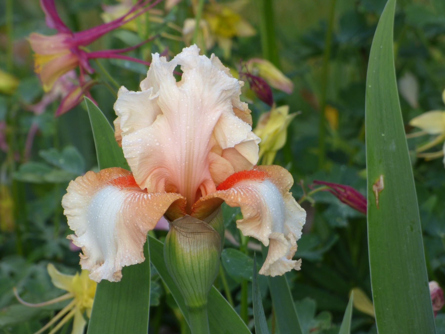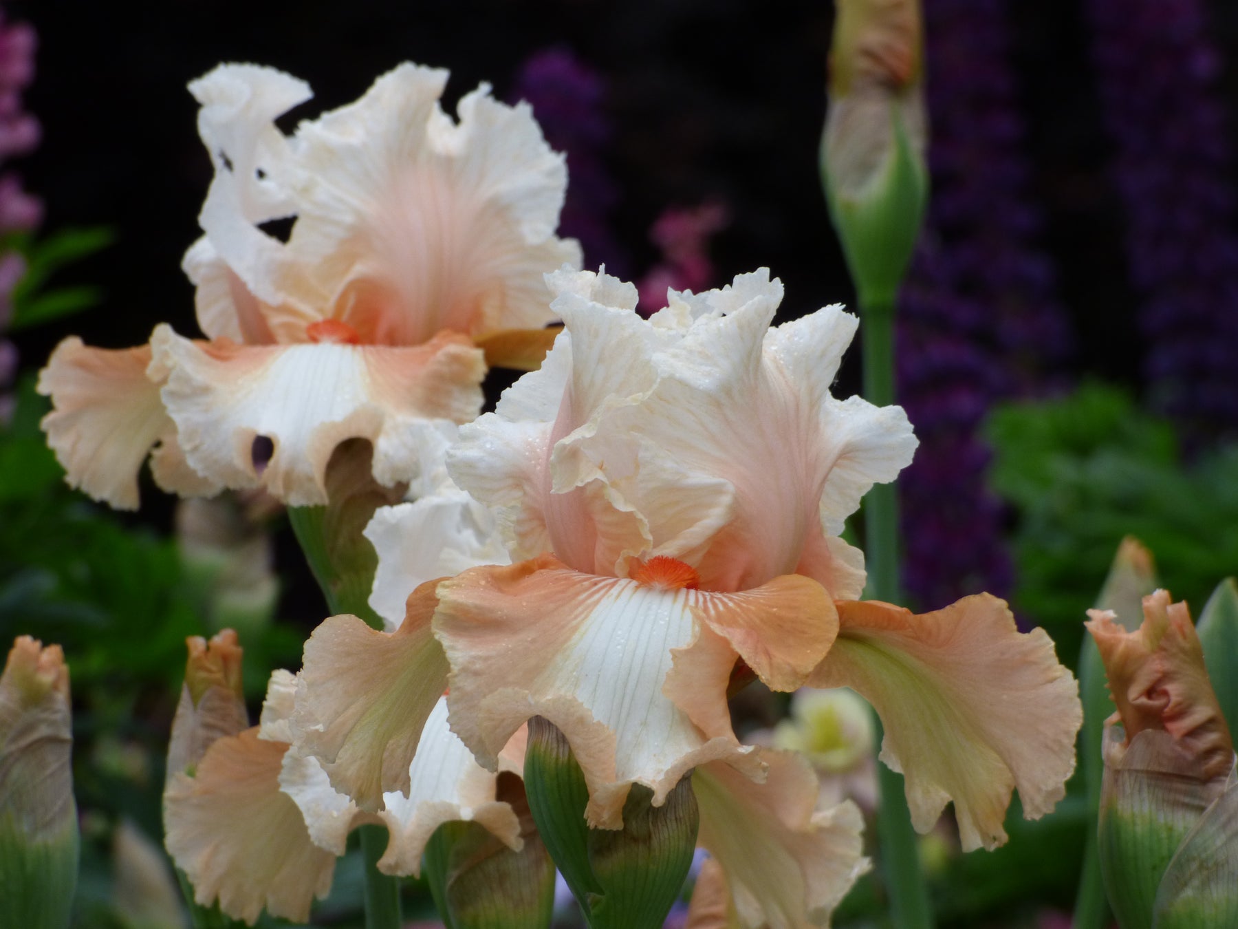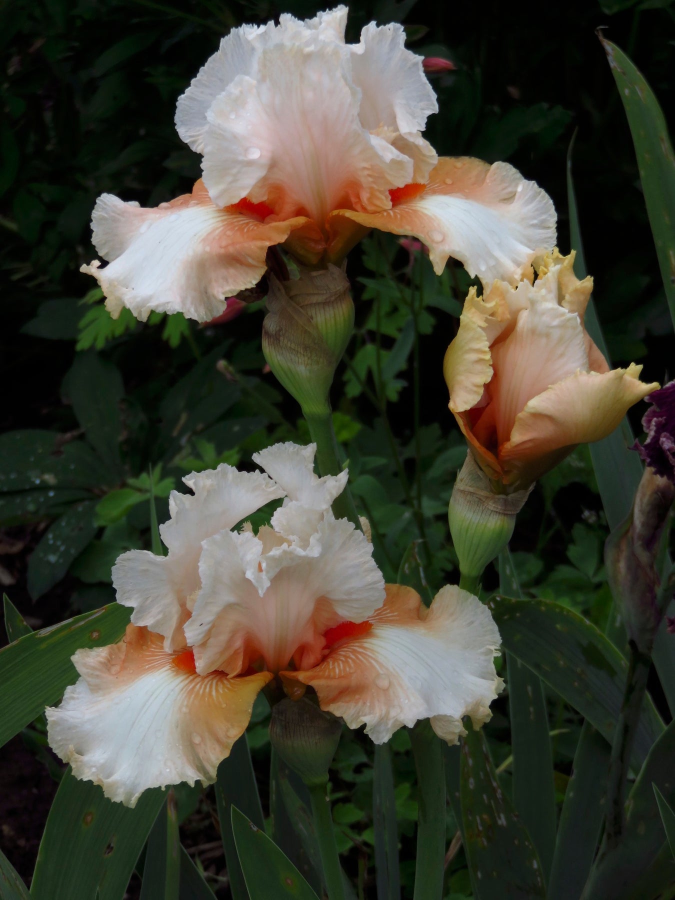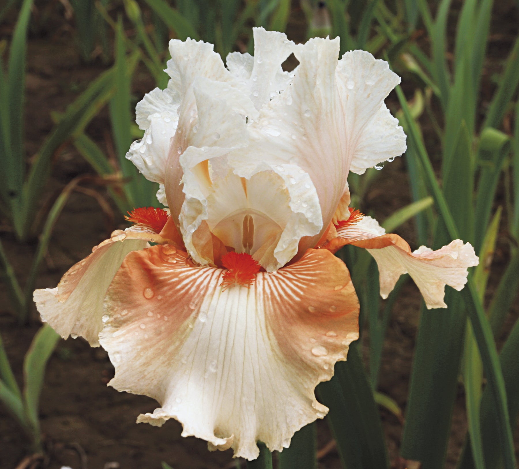 It definitely enhances an Iris when the name fits like a glove, or in this case, shoulder pads. The apricot-peach hafts are unusually large. Creamy white style arms behind vibrant orange beards are critical to its allure. Peach-infused white standards add up to a truly lovely and gentle apparition. Pronounced spicy fragrance.