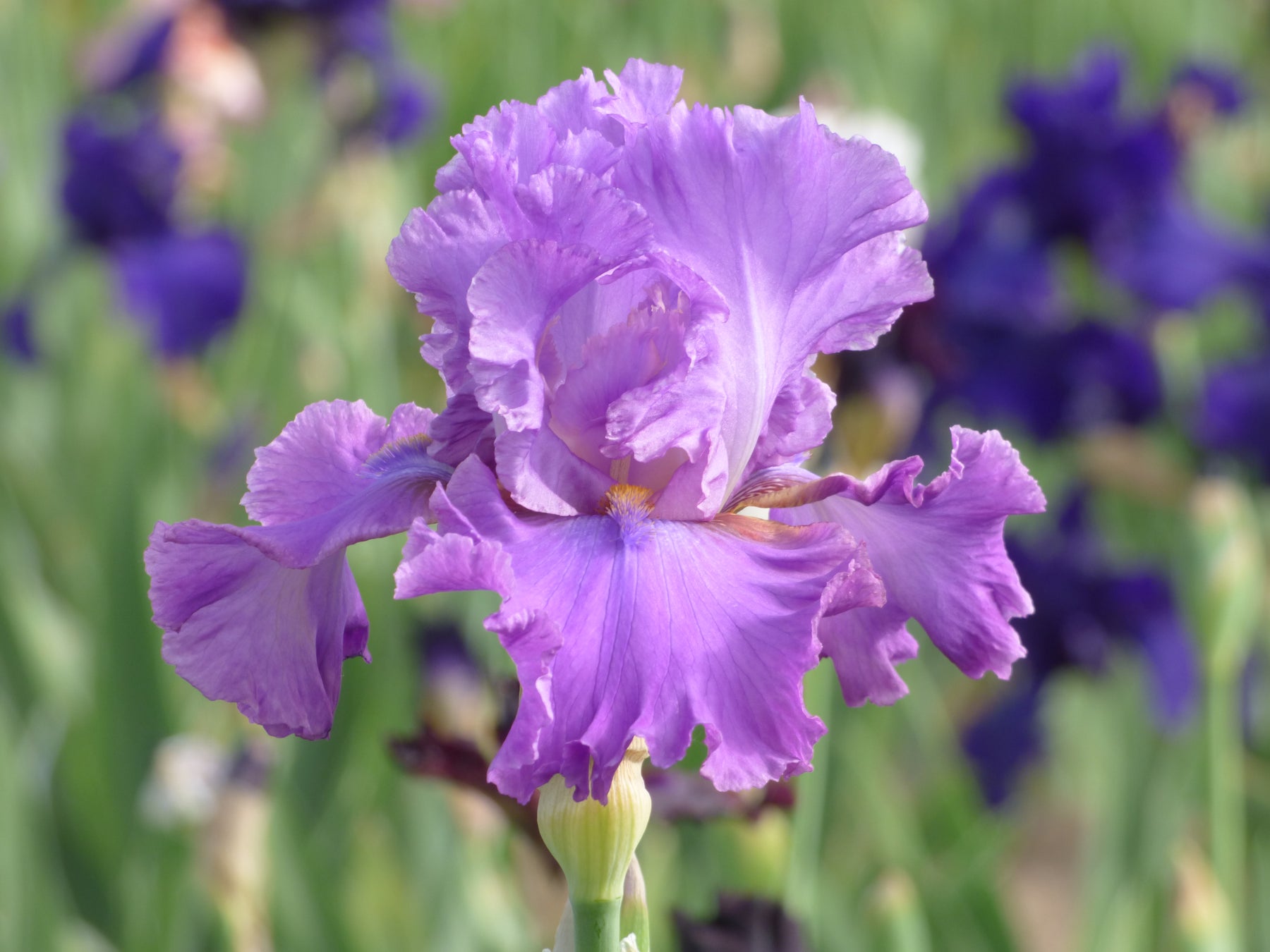 Tall Bearded Iris:  It's not necessary to squint to see the attractive reddish hafts on the darker lavender Sequim (pronounced Skwim). A lavender hue uniformly saturates this late bloomer. See how a near white sinuous line embroiders the petals. Extravagant ruffles, beards lavender in front and red in the rear, 7 to 12 flowers on a stalk - all artfully come into play in this matchless variety. Sequim is the namesake of Sequim, Washington, a city located at the base of the Olympic Mountains, and the lavender capitol of the U.S. Kickstart your garden with a squinch of Sequim.