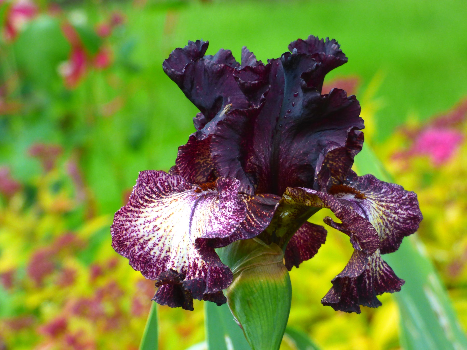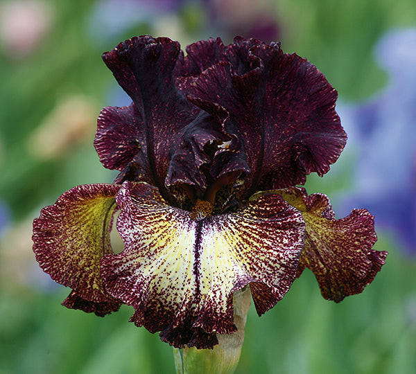 This dark-topped plicata is slightly different than earlier offerings from Mr. Plicata, Keith Keppel. Observe in our photo how the black-red standards have just a slight peppering of yellow. Creamy white centers in the falls warm laterally to a lemon-gold. Speckled red-brown streaks and dotting darken to a 1/2" band at the bottom. This popular must-have has flawless form.