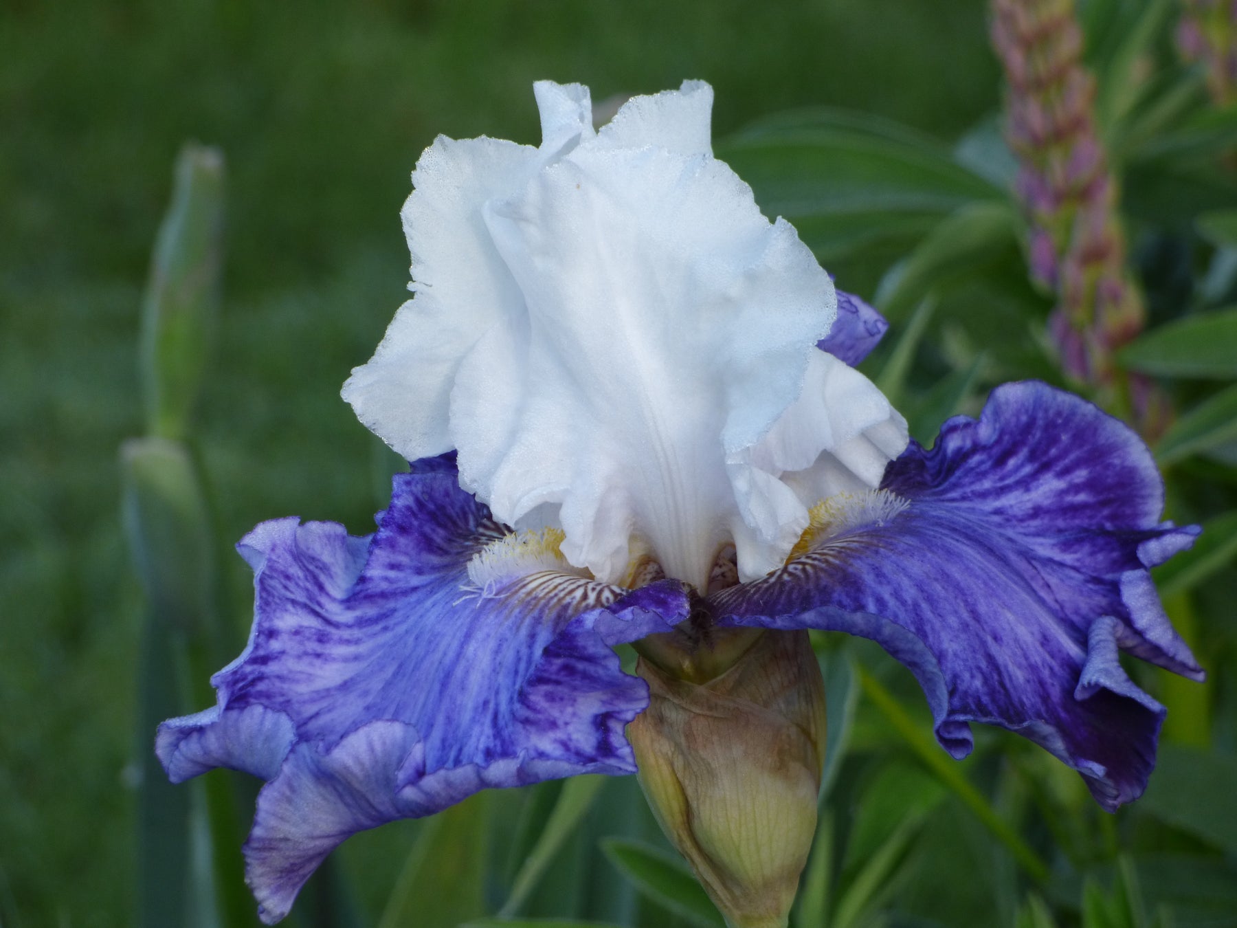 Tall Bearded Iris: For all those flowers that would kill to have some blue in them, Tillamook Bay proudly flaunts its chromatic magnetism atop 37" stalks. This blue amoena's snow-white standards are nonpareil, with a deft touch of blue on the style arms. Subtle rays radiating outward energize the satisfyingly opulent deep blue falls. A slight upturn on the lavender-edged falls provides a nice bit of lan. Anchoring the yellow ground with brown hash marks are pale yellow upturned beards. Robust plant health insures erect stems with 8 buds, as well as strong growth habits. Five rivers gather to form the second largest bay on the Oregon Coast, Tillamook Bay.